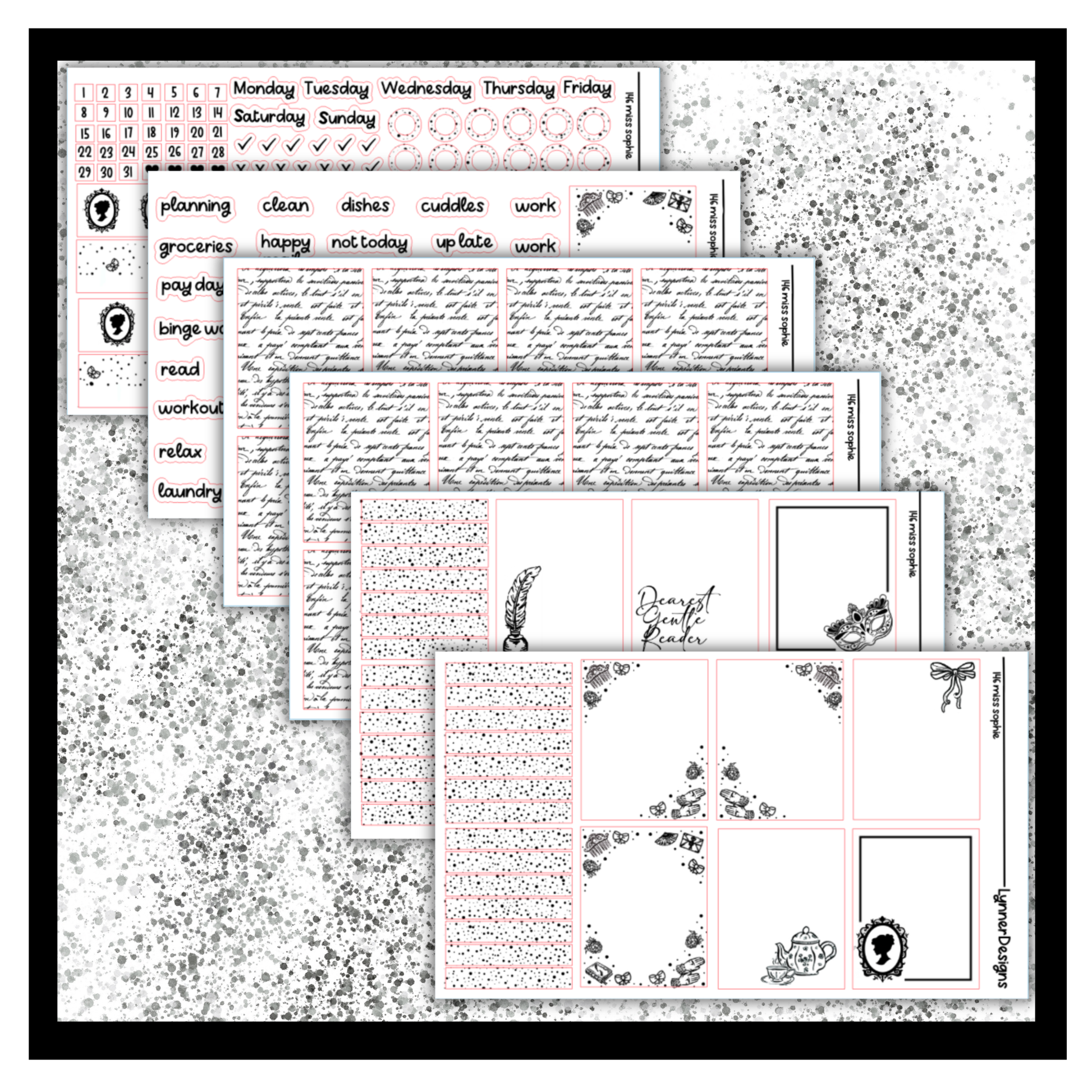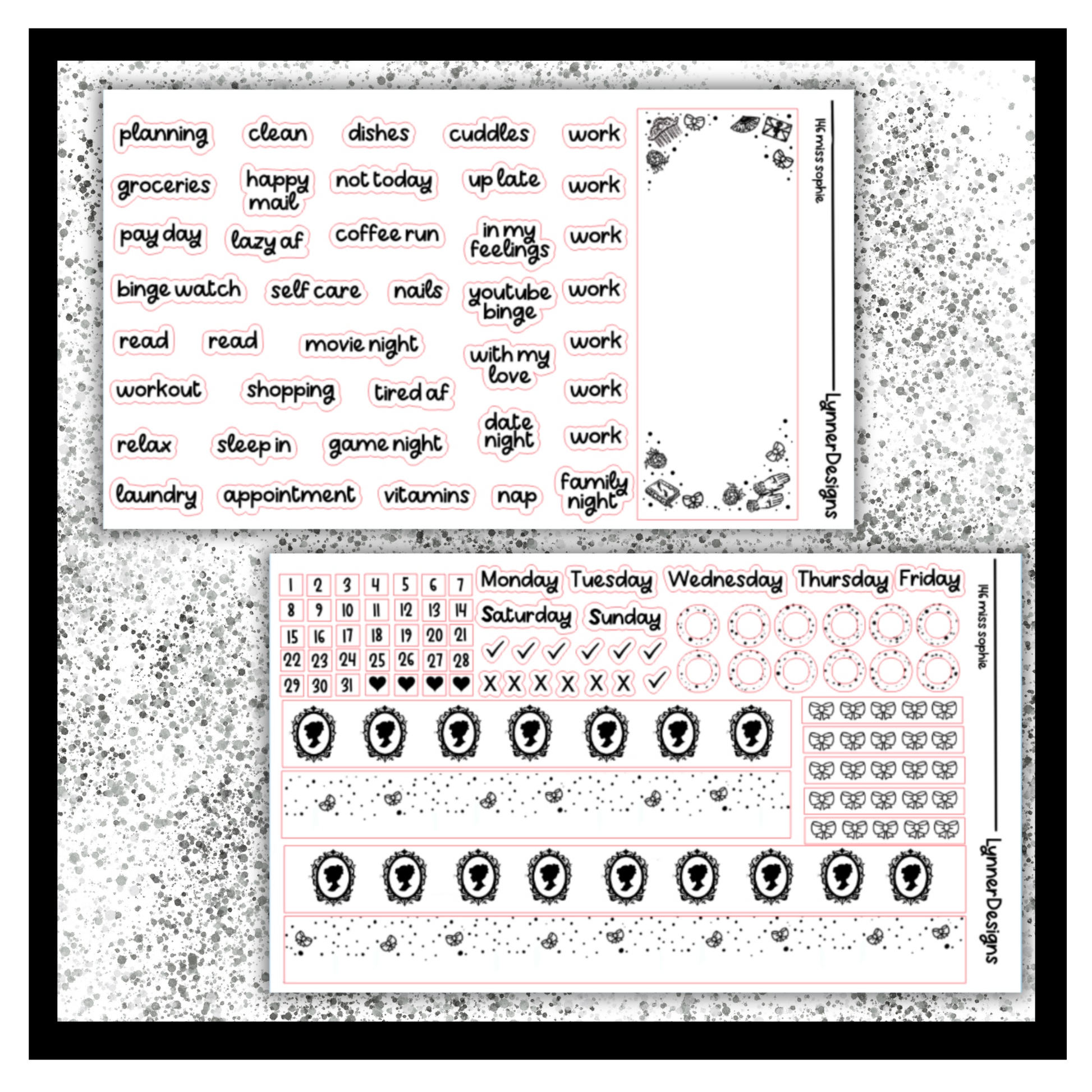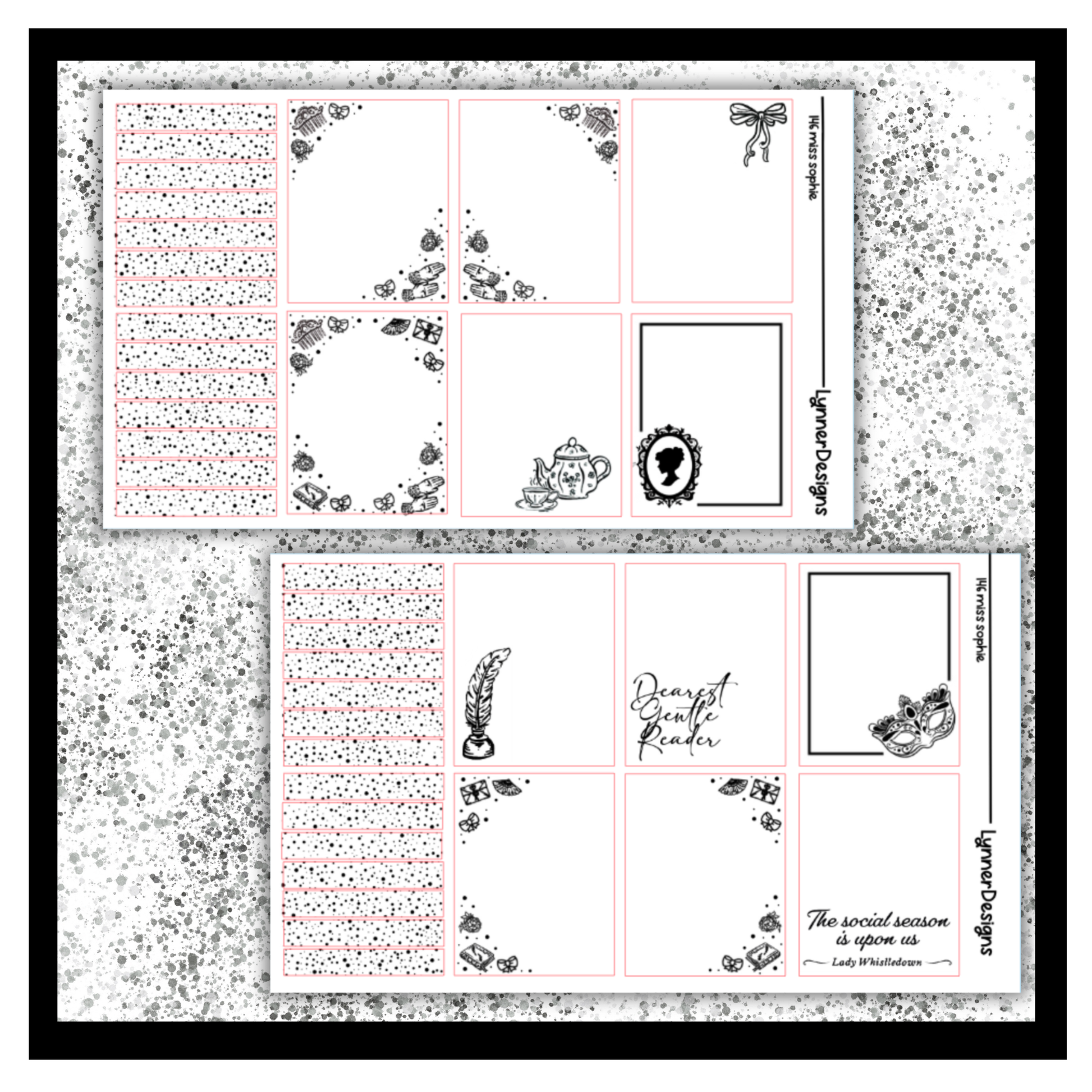 Foiled Packs are made up of SIX sheets of FOILED stickers. They are made to fit most vertical planners. Clear Sticker Paper. They are made to fit a regular size weekly box in an EC vertical but work well in most planners! Dimensions are 1.5x1.9” All stickers come kiss cut, meaning that you just have to peel and place anywhere on your planner where desired! All planner related items from my shop are shipped via a rigid mailer to ensure that they are not damaged during shipping. If you have any questions, please feel free to reach out. Please keep in mind that sometimes colors on the screen will vary slightly from the actual product depending on your monitor settings. Find me on Instagram to keep up with new designs, shop sales, and coupon codes @lynnerdesigns